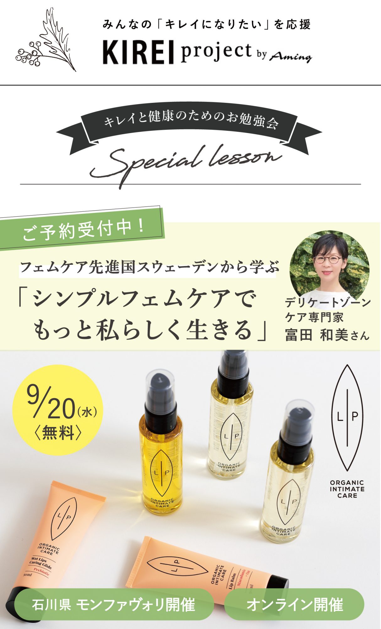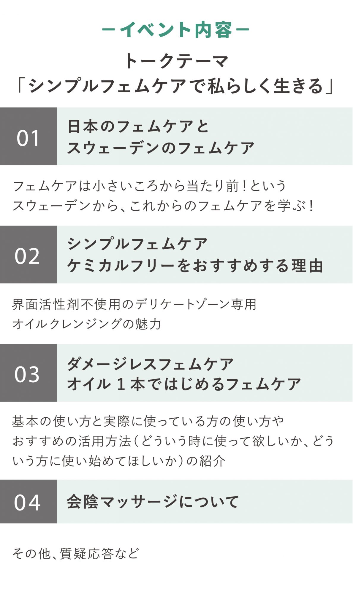 第3回の今回はオーガニック先進国でもある、スウェーデンのフェムケアコスメ『リップインティメイトケア』から代表のハンスさん、髙橋さん、デリケートゾーンケア専門家の富田さんをお招きし「シンプルフェムケアで私らしく生きる」をテーマにしたお勉強会を開催いたします。