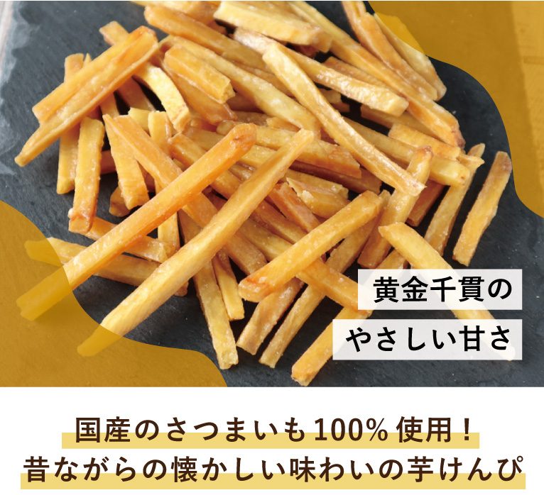 皮の色が黄金色でやさしい甘さが特徴の「黄金千貫(こがねせんがん)」という芋を使用。国産のさつまいも100%で作られています。