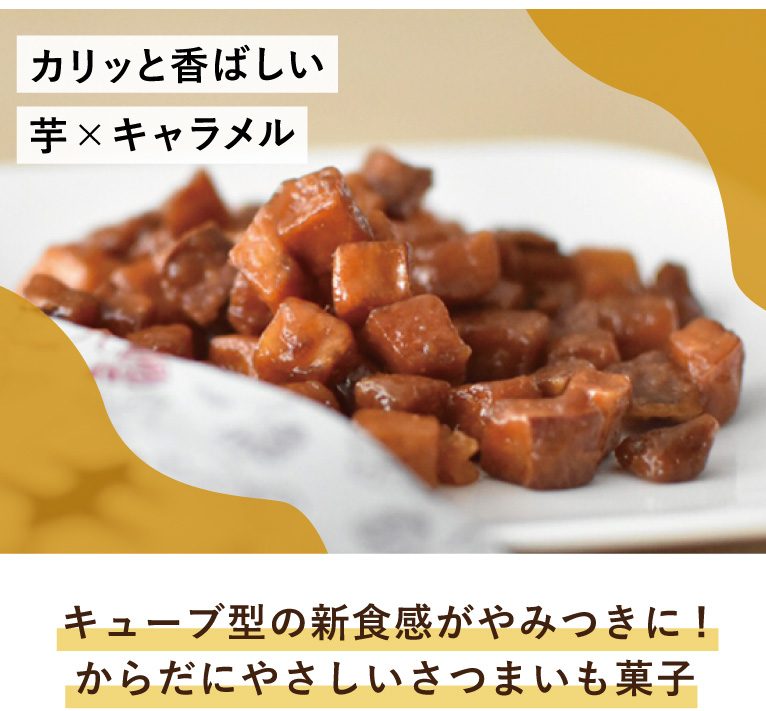 カリッと揚げた芋をキャラメルコーティングして焼き上げた「キャラいも」。南九州産のさつまいもを皮ごと使っており、香料、保存料、着色料不使用でからだにやさしく、お子様にも人気です。