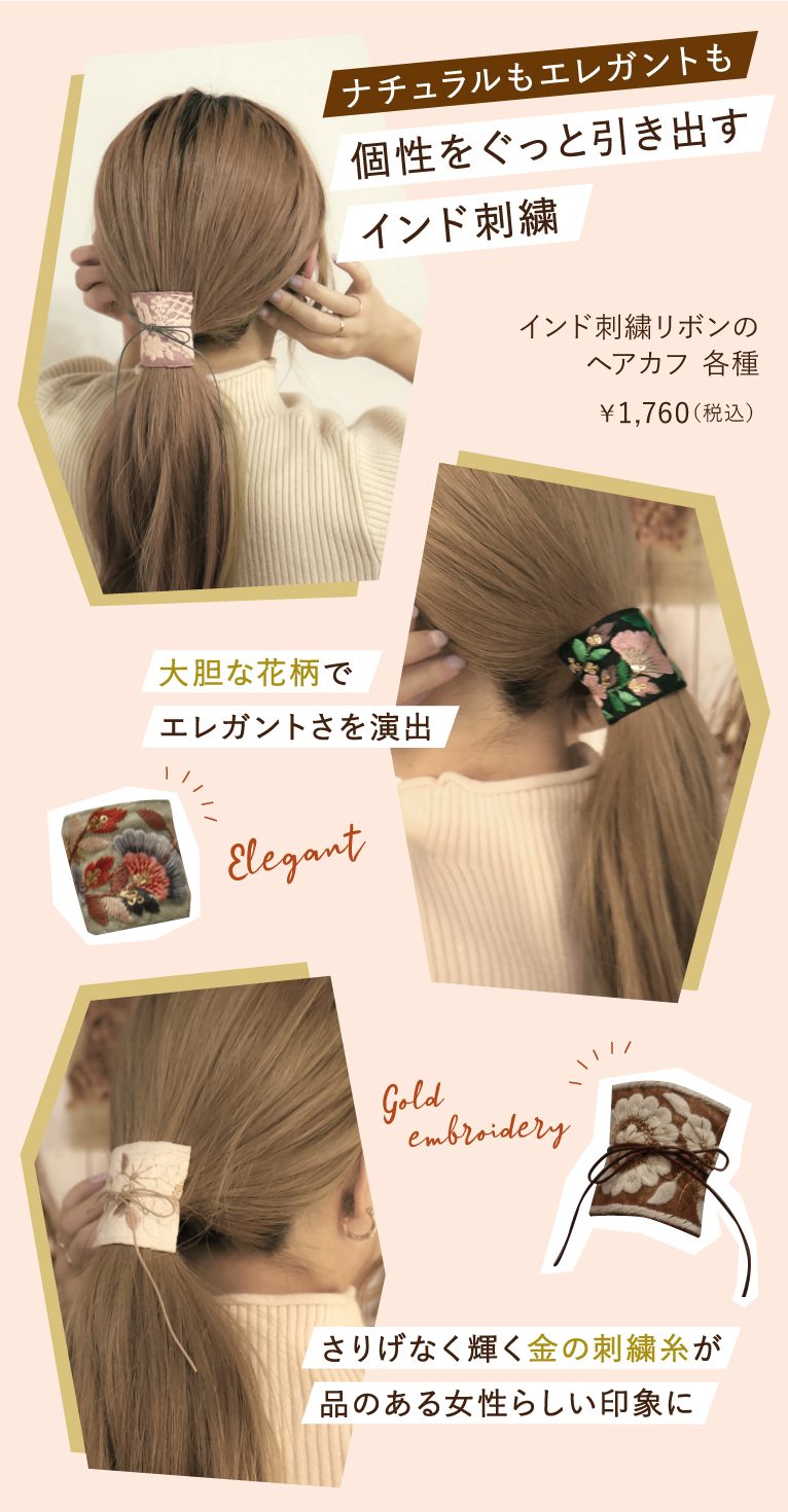 繊細な刺繍と金糸やスパンコールを使った装飾が美しいインド刺繍のヘアカフが登場♪ゴムの結び目に挿すだけで、ナチュラルやエレガントなど、なりたい雰囲気を簡単に演出できます。