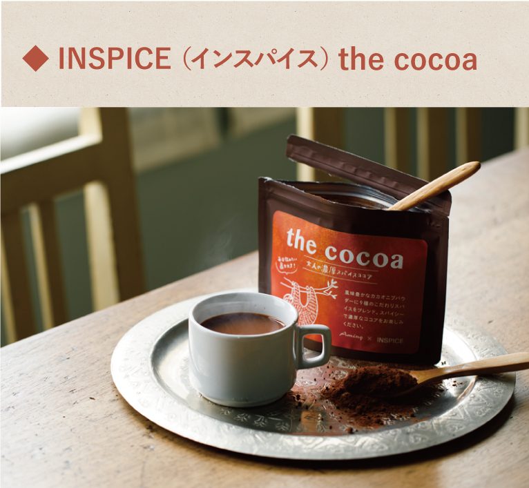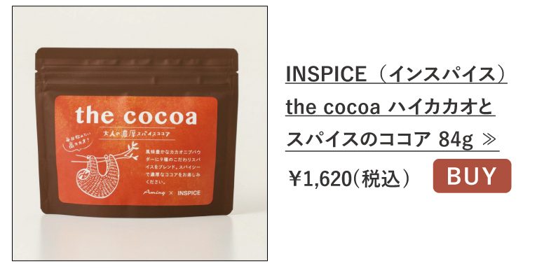 厳選した高品質なピュアココアに、健康を考える方のために「100%カカオ」をブレンド。芳醇なカカオ風味を引き立てる9種類のこだわりスパイスと岩塩を加えました。香味料ブランド『インスパイス』が作るこだわりのクラフトココアです。エスプレッソのような濃厚でリッチなココアドリンクを楽しめる他にも、お菓子や料理にもお使いいただけます。