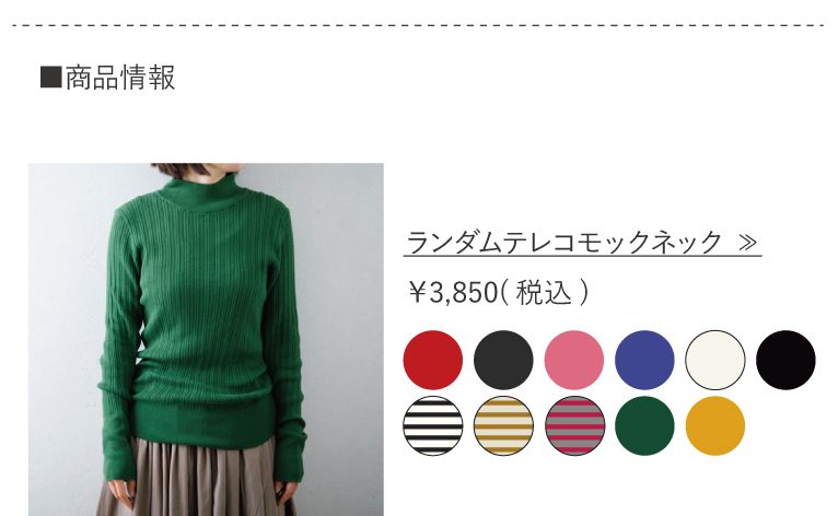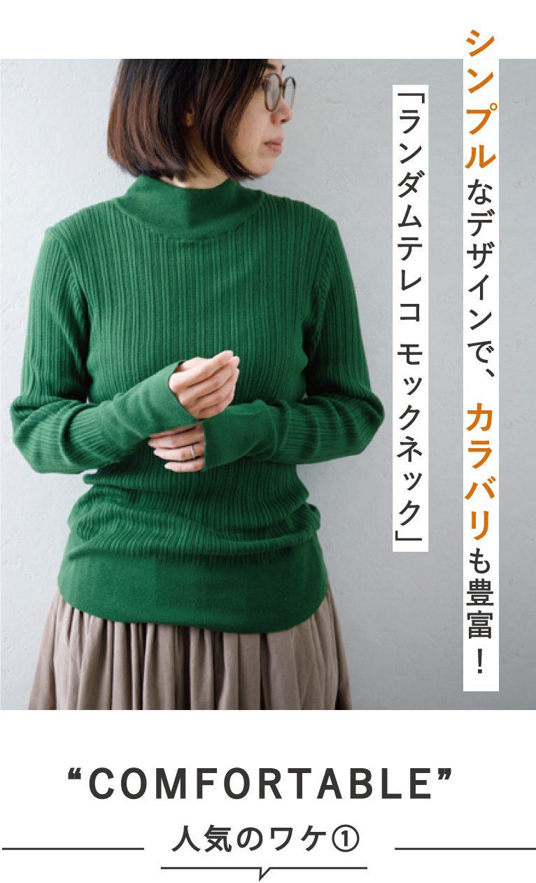 今季一番のおすすめは、昨年の秋冬シーズン売上数ナンバーワンのトップス「ランダムテレコモックネック」。1着は持っておきたい秋冬の必需品です♪