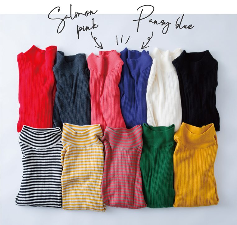 豊富な11色のカラー展開!今年はモノトーン系の定番カラーをはじめ、コーディネートの差し色になるビビットカラー、ボーダーも豊富に品揃え。特に注目したい新色は「パンジーブルー」や「サーモンピンク」。