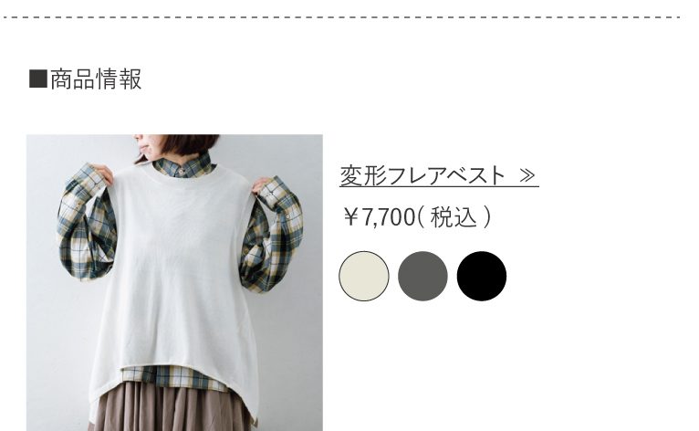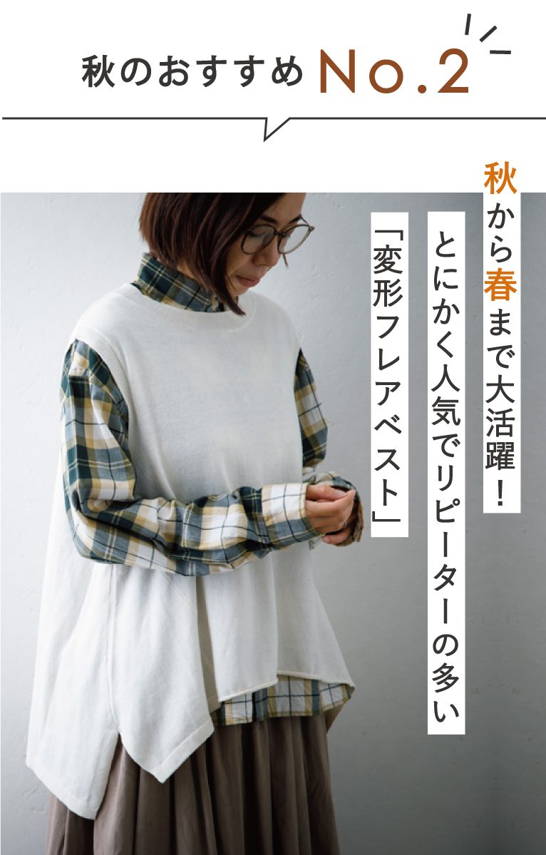 ゆるやかなAラインで綺麗なシルエット&ゆとりのあるアームホールで、ワンピースやブラウスと重ね着してもごわつきません。すとんと落ちるフレア感が可愛く、コーディネートに取り入れるだけで存在感を出せて、幅広いレイヤードスタイルが楽しめます。綿100%ニットならではのさらっとした肌触りもうれしいポイントで、お家でお洗濯ができます。