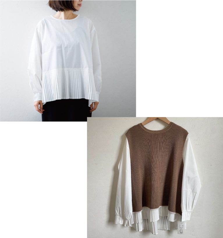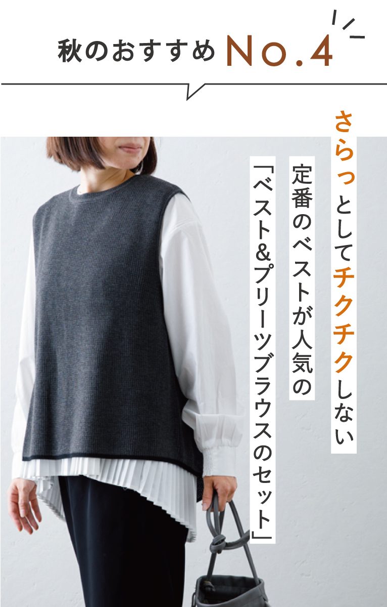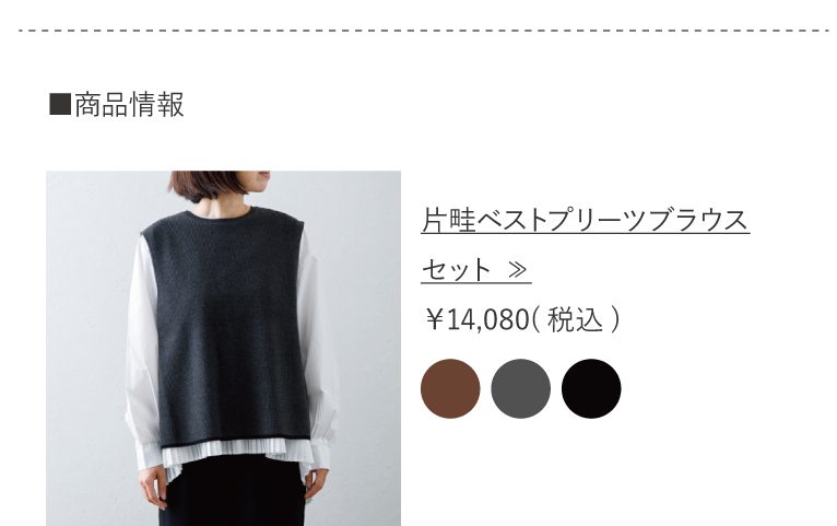 バックスリットタイプのベストに、プリーツのブラウスを組み合わせしました!セット着用はもちろん、ベスト・ブラウスそれぞれ単品でお手持ちのアイテムと合わせることもできる、着回し力の高さも魅力です。