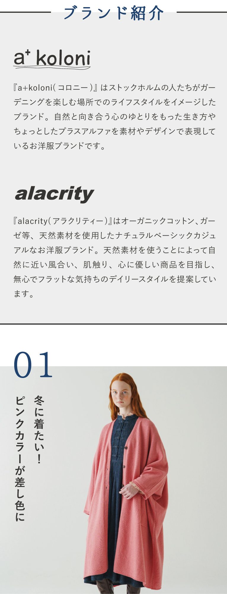 素材やカラーにこだわったナチュラルベーシックスタイルを提案する『a+koloni(コロニー)』『alacrity(アラクリティー)』の新商品が続々入荷。アミングでも人気の2ブランドから、この冬おすすめの着こなしをご紹介いたします。