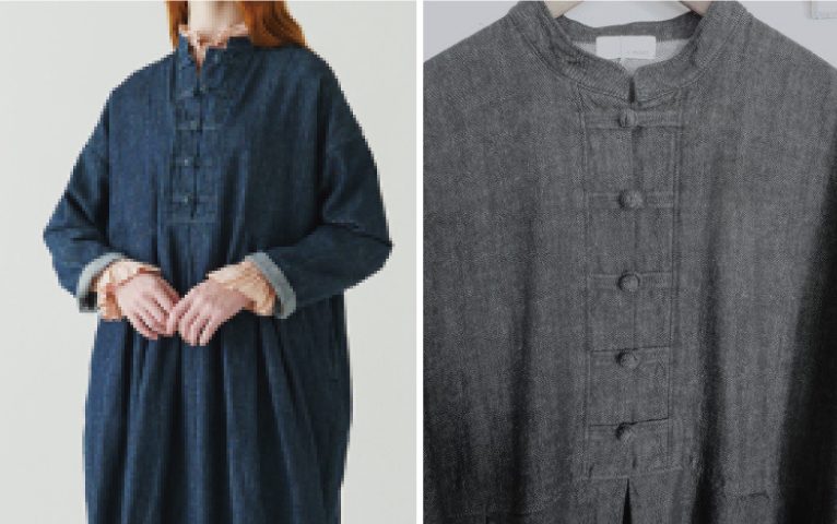 中に合わせた綿麻素材のデニム生地のワンピースは一年を通して着用しやすい、ほどよい厚みで柔らかな素材。フロントのチャイナボタンがアクセントになり、1枚でも主役になるワンピースです。