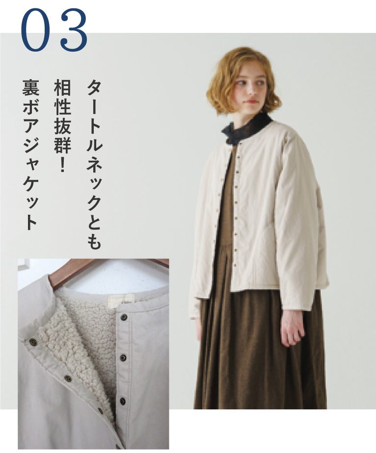 人気の裏ボアコートと同シリーズの、ショート丈ジャケット。アンティークなドットボタンが大人っぽく、すっきりとしたノーカラーデザインで、タートルネックやストールとの相性がgood。短めの丈はボトムとのバランスがとりやすく、スカートやボリュームのあるパンツと合わせてもすっきりまとまります。
