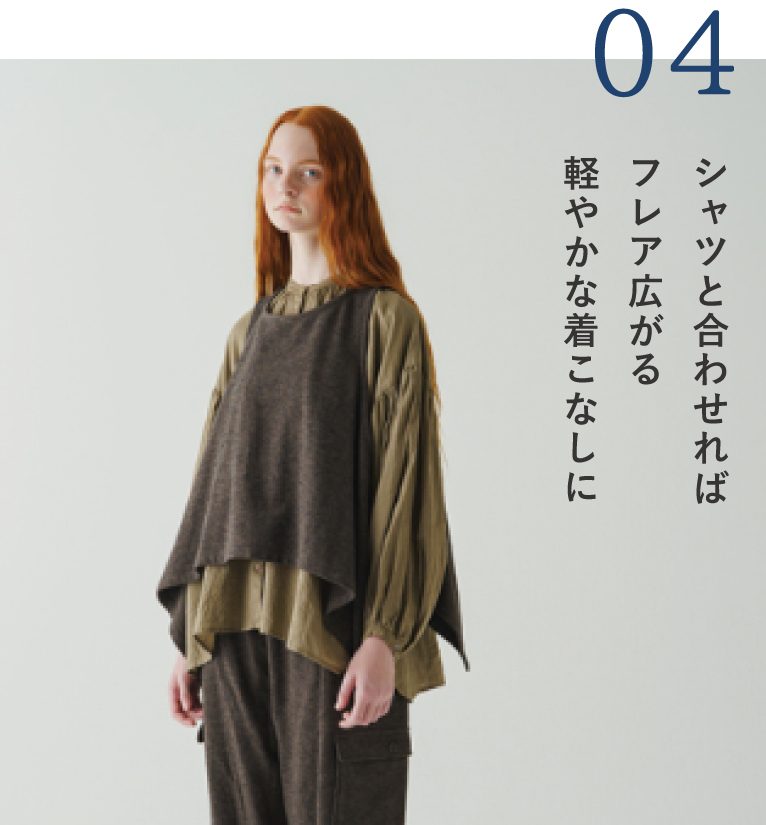 ミックス感のあるコットン100%メランジ起毛は、ほどよい厚みがあって軽くソフトな風合いです。『a+koloni』で人気のワイドベストは、ゆったりとした身幅でアーチを描いたような裾がアクセントに。中に着るもののシルエットを邪魔せずふわりと重ねられる大人かわいいベストです。