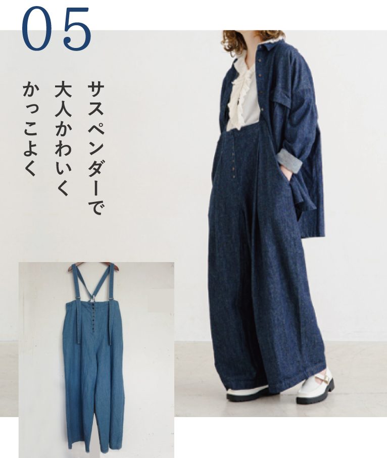 『alacrity』のデニムサスペンダーパンツはやわらかなコットンリネンのデニム生地を使用。肩紐の長さを調整してウエスト位置を変えることで様々な着こなしが楽しめます。裾に向かってストンとしたワイドなシルエットがとても大人っぽく、かわいいデザインです。ウエストにある後ろの紐を絞ってパンツとしても履いていただけます。