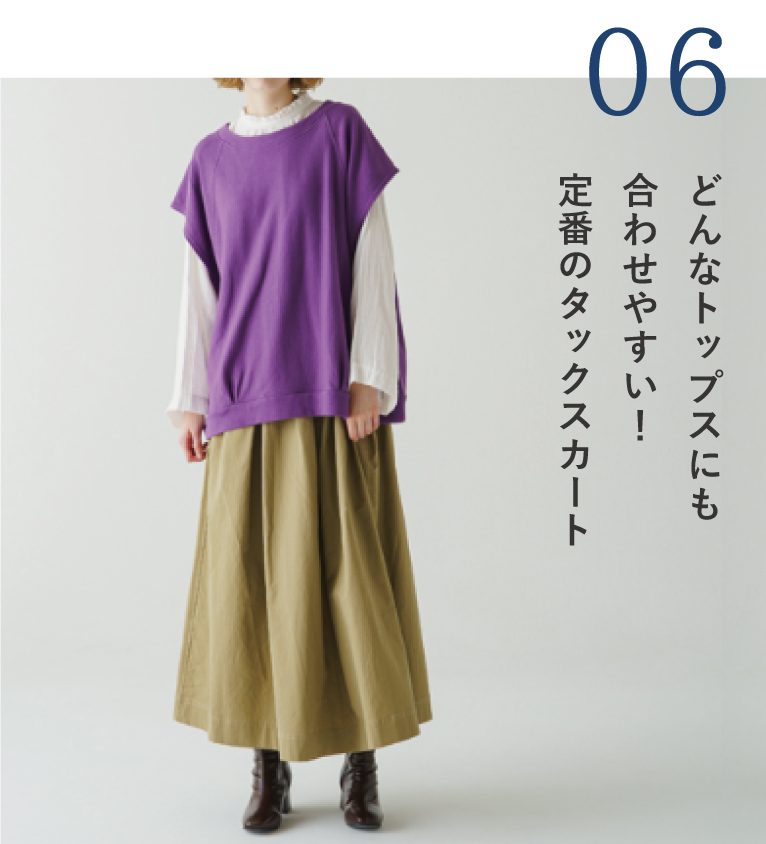 通年履けるコットン100%ツイル生地を使用した心地良いハリのある風合いのタックスカートです。生地をたっぷり使っていて、女性らしいフレア感を出しながら、ウエストはタックできちんと見せているので、膨れすぎずすっきりしたラインをキープしてくれます。ウエストはゴム仕様で、紐で調節可能です。
