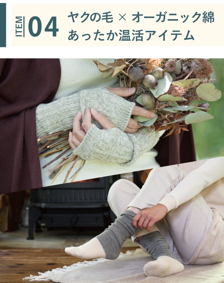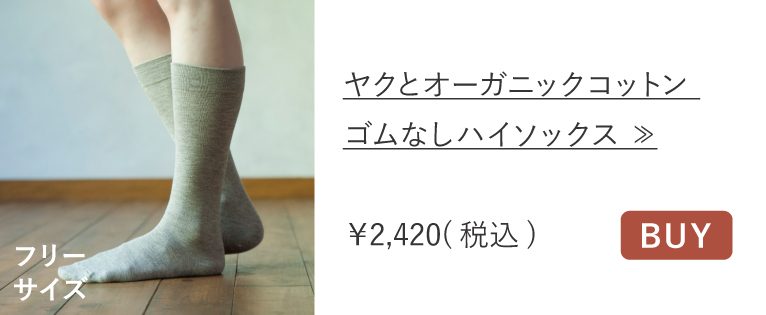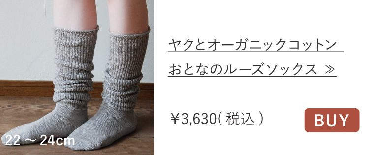 肌に直接触れるものは素材にこだわりたいですよね。『天衣無縫』の「ヤクとオーガニックコットン」シリーズの腹巻や靴下は、標高が高く氷点下30度の厳しい環境下に生息するウシ科の動物「ヤク」の毛と、オーガニック栽培された超長綿をブレンドしています。