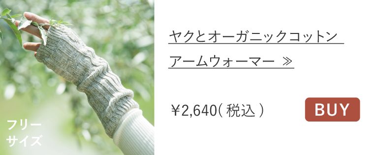 ヤクの毛は保温性が高く、優れた通気性も備えています。あたたかく蒸れにくいので冬の寒さ対策はもちろん、夏の冷え対策にもおすすめ。一年中、お守りのように身に着けていたいアイテムです。