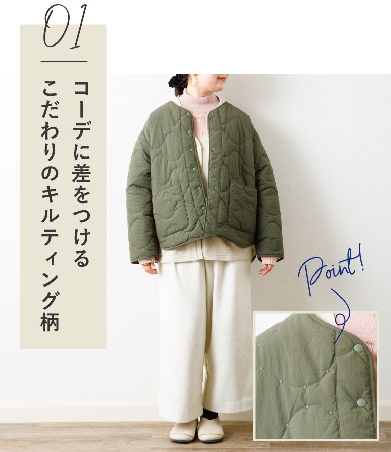 シボ感のあるポリエステル生地に中綿を縫い合わせて防寒性を持たせた中綿ジップコート。柔らかくふくらみのある生地感が特徴。表地と裏地でステッチの形状を変えてデザインに変化を持たせています。