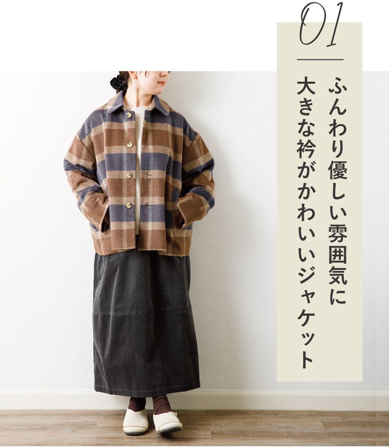 大きな衿が特徴のショートジャケット。短めの着丈でスカートやワンピースと合わせてもバランスがよく、日々のコーディネートに取り入れやすくなっています。