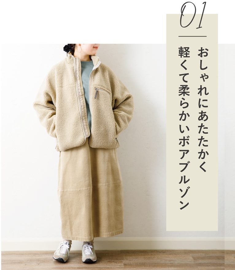 『Gymphlex(ジムフレックス)』のボアコート。表地は非常に柔らかく軽さが特徴のジムフレックスオリジナル生地“COZY LIGHT BOA”を使用し、風を通しにくいリップストップナイロンを裏地に使用することで、軽くてあたたかいボアブルゾンに仕上げています。ダブルジップになっており、閉め方によって様々な着こなしを楽しめます。