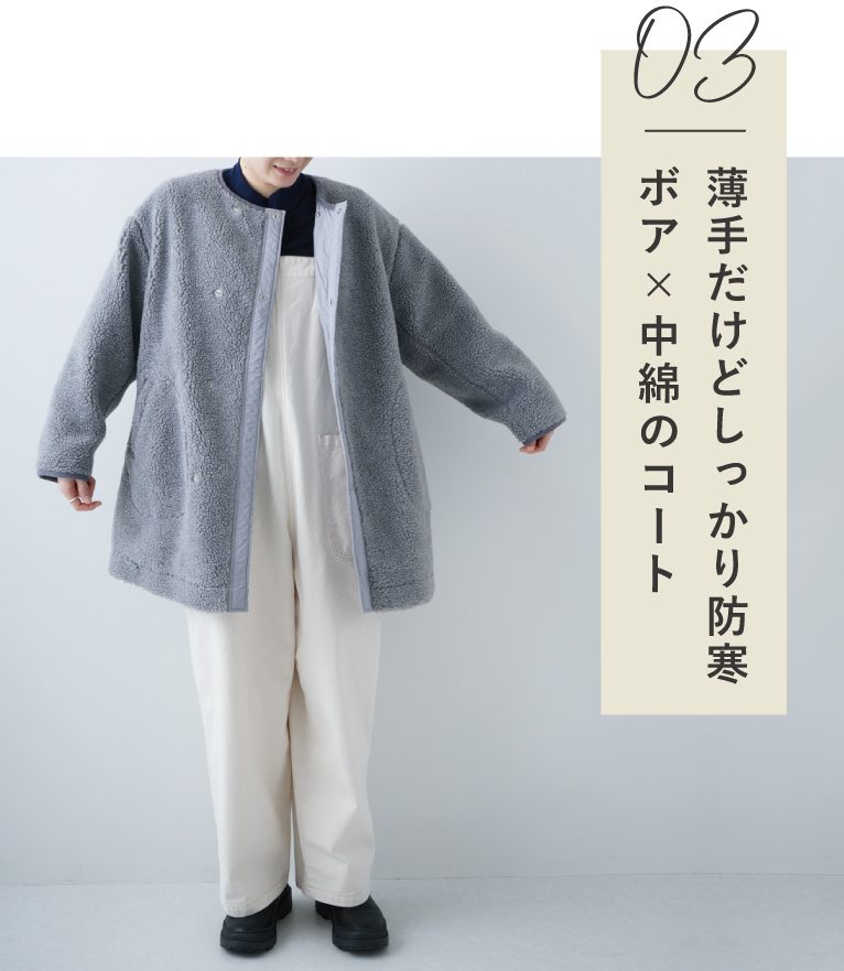 洗い込んだ風合いが特徴の綿麻シーチング。一見薄手のコートに見えますが、中綿を取り入れることでしっかり防寒。首回りは小さな襟のように立ち上がらせてもかわいくて◎
