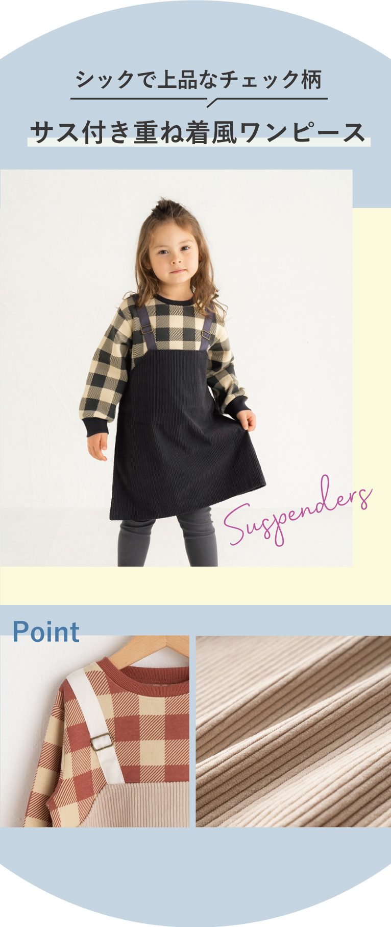 人気のサス付きシリーズからチェック柄が登場!サスペンダーはドッキング仕様で活発に動き回ってもずり落ちてきません。女の子らしいAラインシルエットのスカートがとてもかわいいジャンパースカートです☆