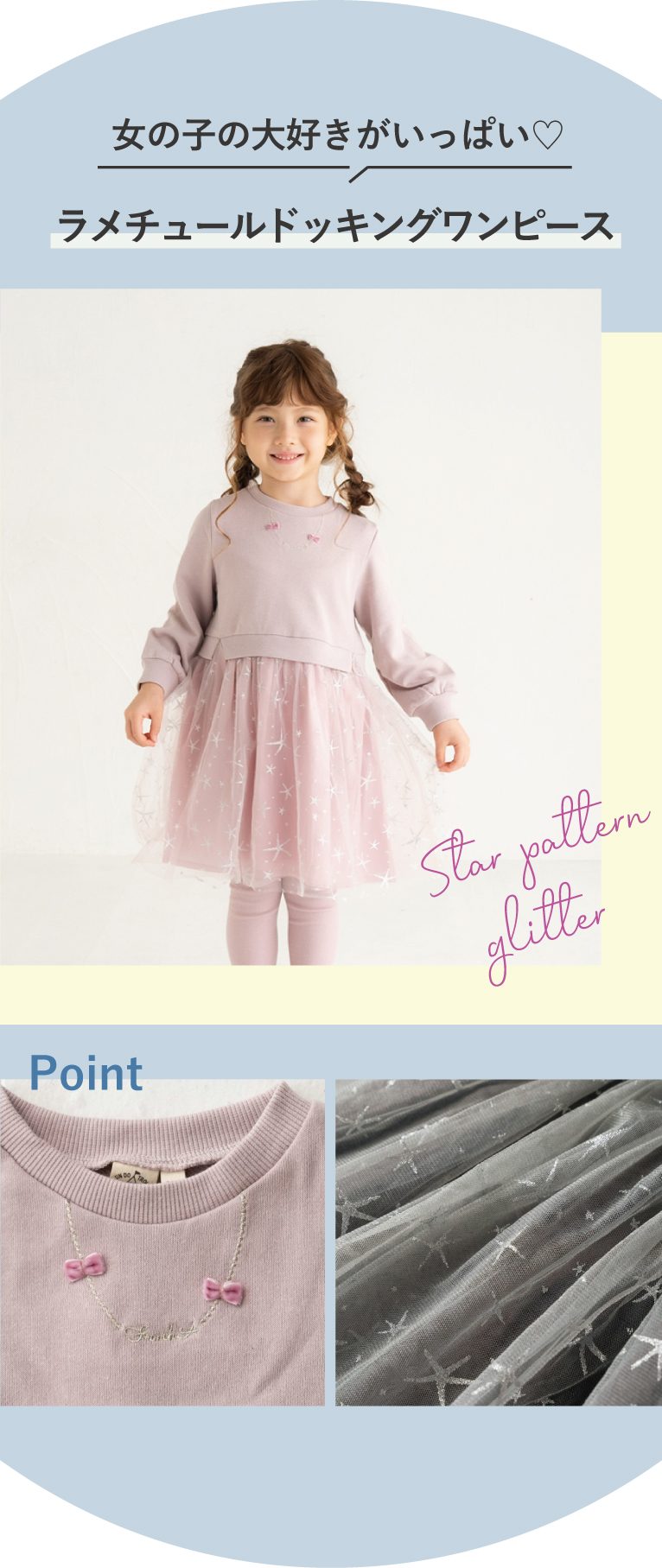 動くたびに揺れる星柄ラメのチュールが華やかでハレの日にピッタリのワンピースです。胸元のネックレス刺繍が女の子らしい雰囲気♪直接肌が触れるトップス部分には裏毛を使用し、着心地も◎
