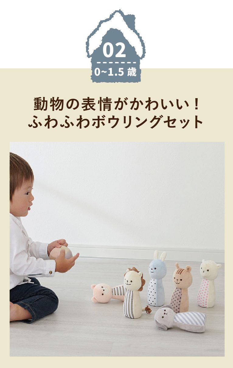 ボールを転がして動物のピンを倒すと、中の鈴が優しく鳴ります♪ふわふわとしたやわらかい素材と色彩の布おもちゃなので、ご出産祝いやファーストトイにぴったりです。ボウリング遊び以外にも、ラトルやごっこ遊びができるので、親子や兄弟姉妹、お友達とのコミュニケーション能力も楽しく育めます。