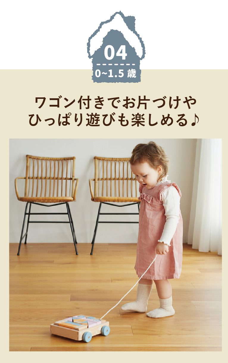 20個の積み木がワゴンに入った木製おもちゃ♪丸・三角・四角などいろんな形のブロックが入っているので、想像力を養いながら遊べます!ワゴン付きで、ひっぱり遊びを楽しめるのもうれしいポイント◎積み木はワゴンにぴったり収まるので、パズル感覚で楽しくお片付けできます。
