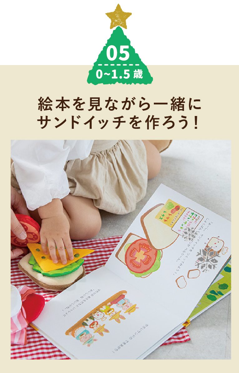 絵本とサンドイッチのおもちゃのセット。お子さまに人気のままごと遊びを、ままごとに興味を持ちだす低年齢のお子様から遊べるように布でつくりました♪