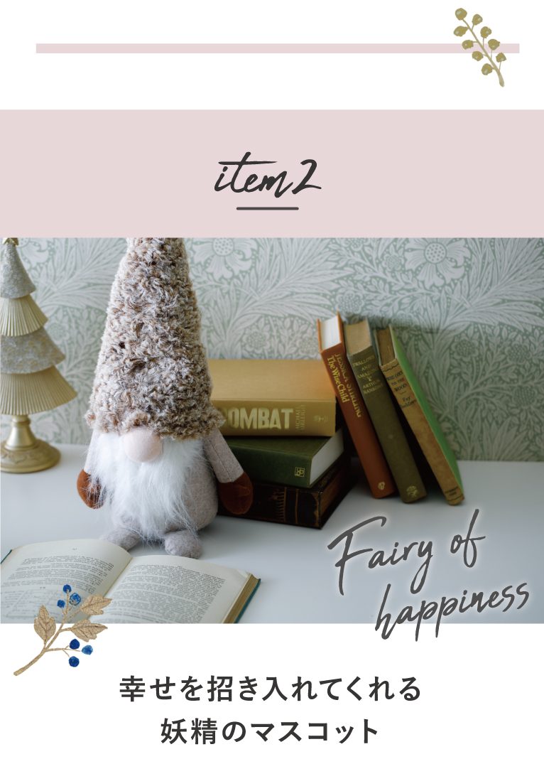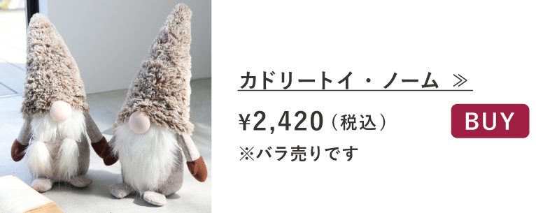 ふわふわの帽子とたっぷりのおひげが特徴の冬の妖精ノーム。スウェーデンでは古くから『トムテ』と呼ばれて親しまれています。トムテは家族に幸運をもたらし、仕事を助けてくれる妖精として知られています。玄関やお部屋の入口でお客様をお出迎えしてくれます♪