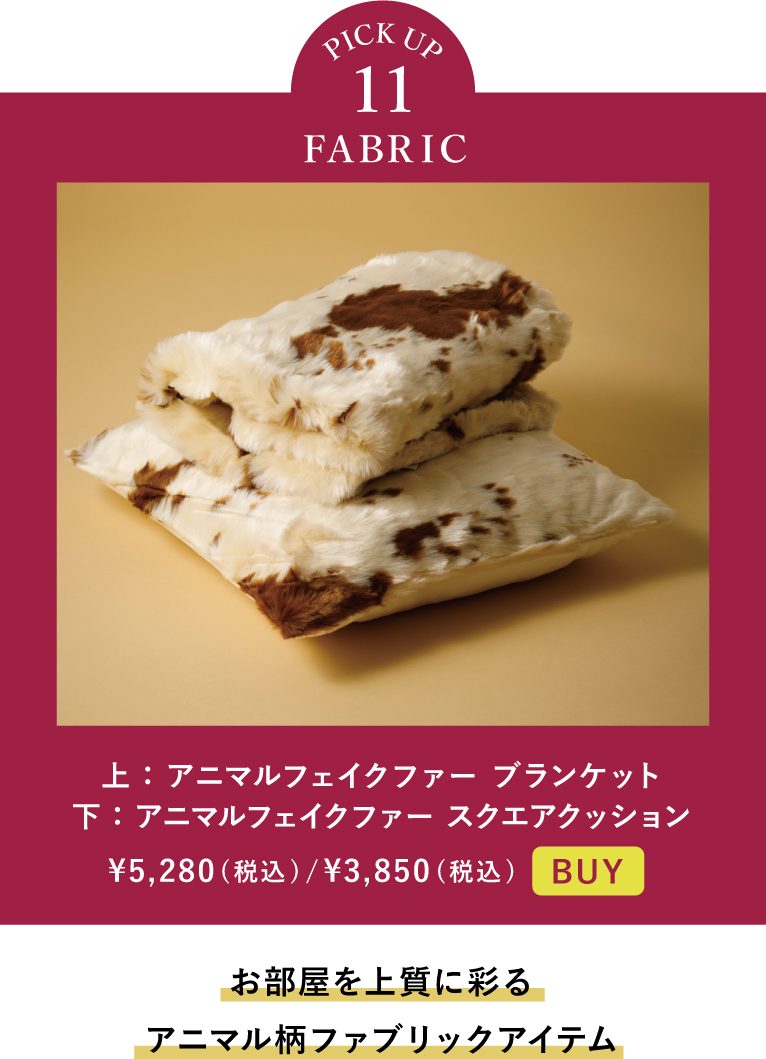 クッションは裏面にマイクロファイバー生地を、ブランケットは裏面にボアをあしらい、触り心地も◎ウシ柄やコヨーテ柄、シカ柄もあり、リッチな質感がお部屋の中を贅沢な空間に演出します。