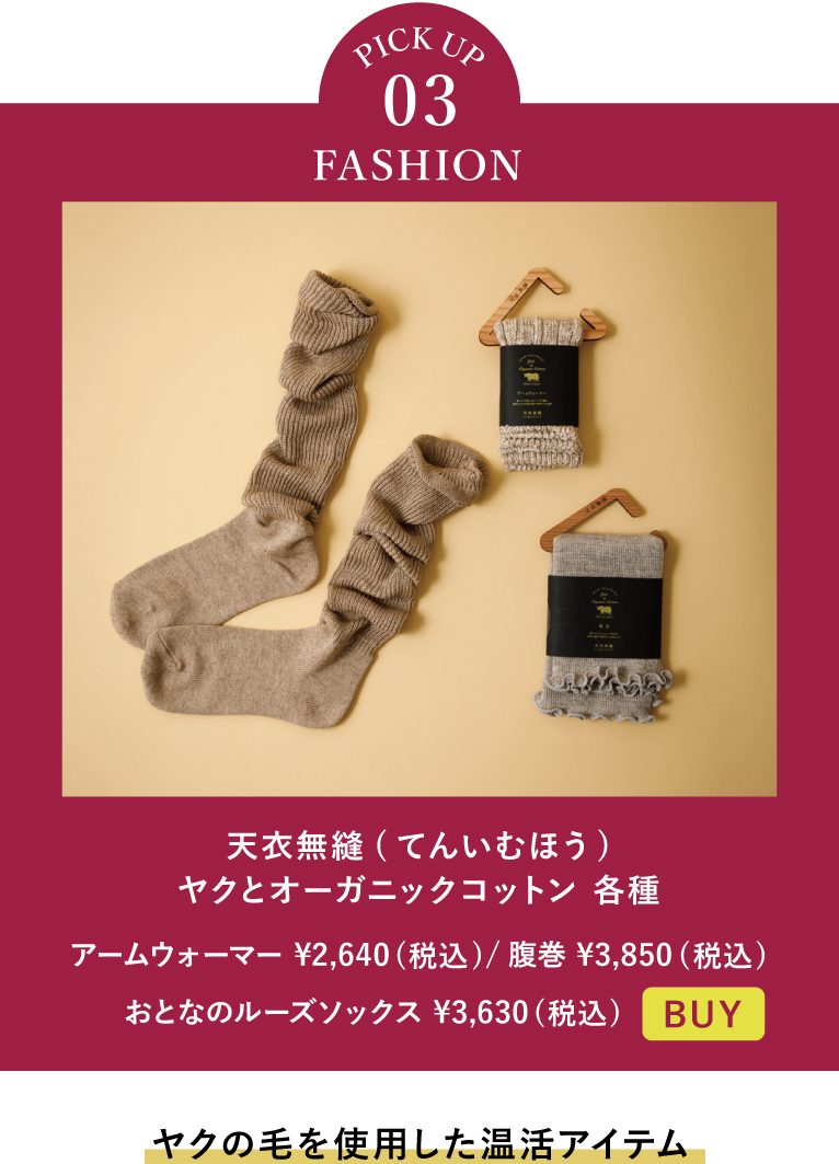 ヤクの毛は保温性が高く、優れた通気性も備えています。あたたかく蒸れにくいのでずっと着けていたくなる心地良さ。おとなのルーズソックスやアームウォーマー、腹巻やハイソックスなど種類豊富にそろえております。