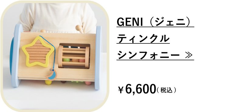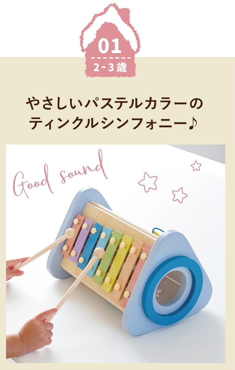 鉄琴・ドラムを「たたく」、ラトル・歯車を「まわす」、ギロを「こする」という動作から音が出る楽しさを自分で発見し、音の違いも自然に理解していきます。やさしいパステルカラーやきらきらお星さま&お月さまのモチーフで想像力を大きく広げます♪