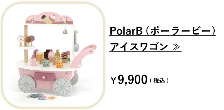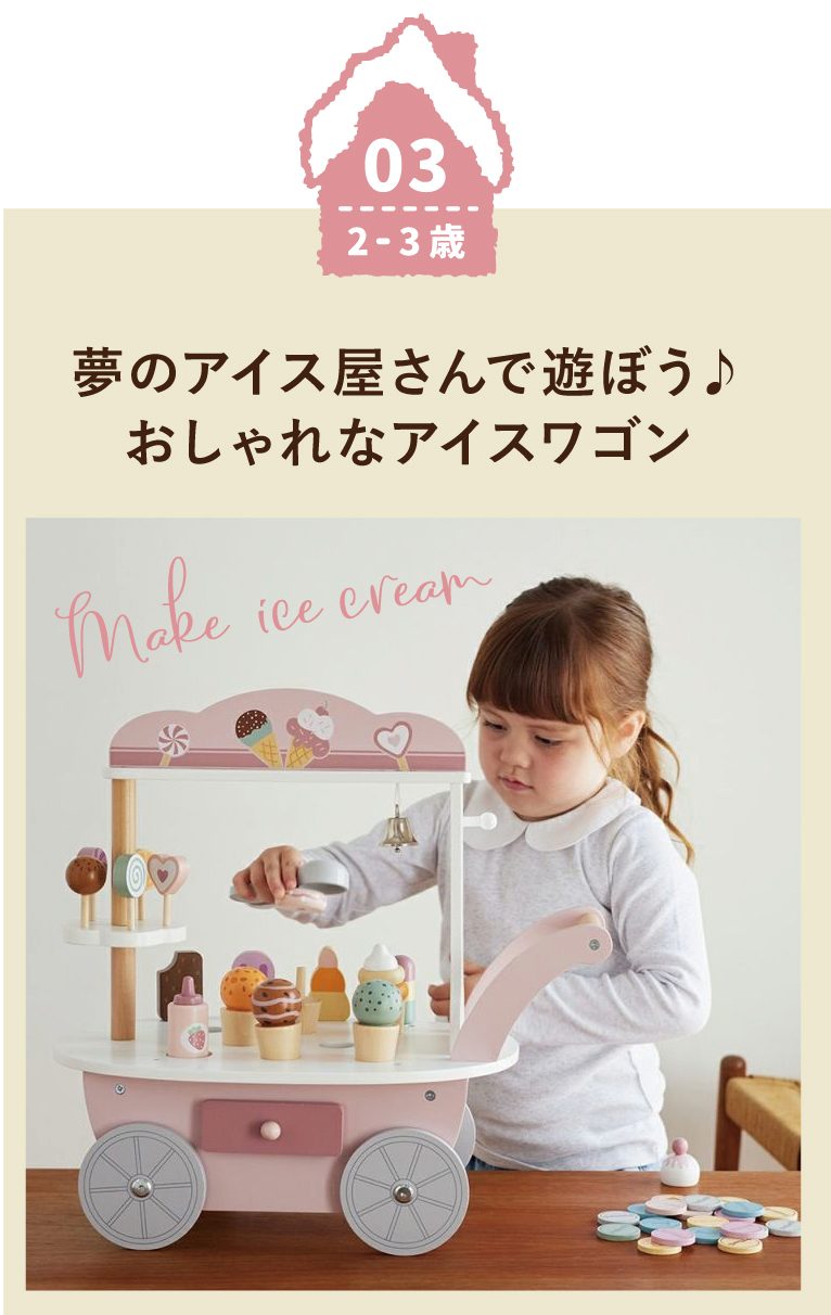 アイスクリーム、ソフトクリーム、アイスキャンディー、キャンディー、ソースボトル、スクープ、コインがついたアイスワゴン。アイスクリームとコーンは自由に組み合わせられるので、遊びの幅が広がります。付属のコインで楽しくお店屋さんごっこができて、カラフルな色味とかわいいデザインが乙女心をくすぐるアイテムです。