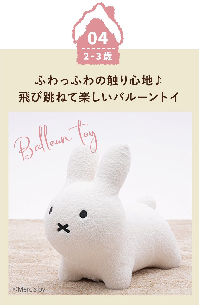 ディック・ブルーナが描く絵本の世界のうさぎ「ミッフィー」のかわいいバルーントイ。ふわふわな生地は手洗いでお洗濯OK!汚れてしまってもお手入れができてママにもうれしいアイテムです。3歳頃から体重90kgくらいまでの大人でも乗ることができ、バランスボールのようにパパやママも一緒ににエクササイズを楽しんでも◎