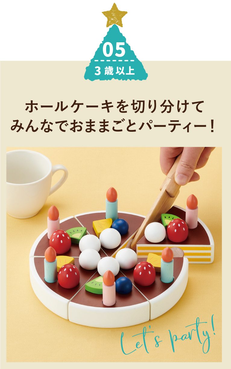 いちごやキウイなどのフルーツとクリームを自由にトッピング!仕上げにローソクを立てればすてきなパーティーの始まり!ケーキ本体はクリームケーキとチョコケーキの2WAY仕様。自由にケーキにトッピングする楽しさや、ケーキをサクッと切る本格的な感触は、お子様を夢中にさせます。おままごと遊びを通じて想像力や社会性を豊かに育みます♪