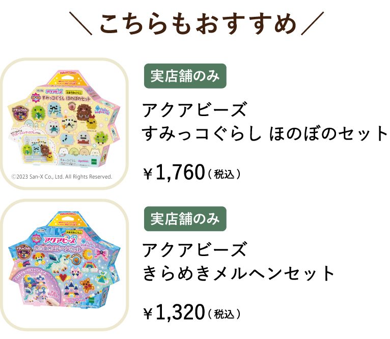 【取り扱い店舗】アミング各店※アクアビーズ「すみっコぐらし おでかけトランク」 は石川県モンファヴォリでは取り扱っておりません※アクアビーズ「すみっコぐらしほのぼのセット」「きらめきメルヘンセット」は石川県モンファヴォリ、オンラインショップでは取り扱っておりません※LaQ(ラキュー)「スイートコレクション ドレスアップ」「ボーナスセット 2023」「ダイナソーワールド ティラノサウルス」は石川県モンファヴォリ、オンラインショップでは取り扱っておりません