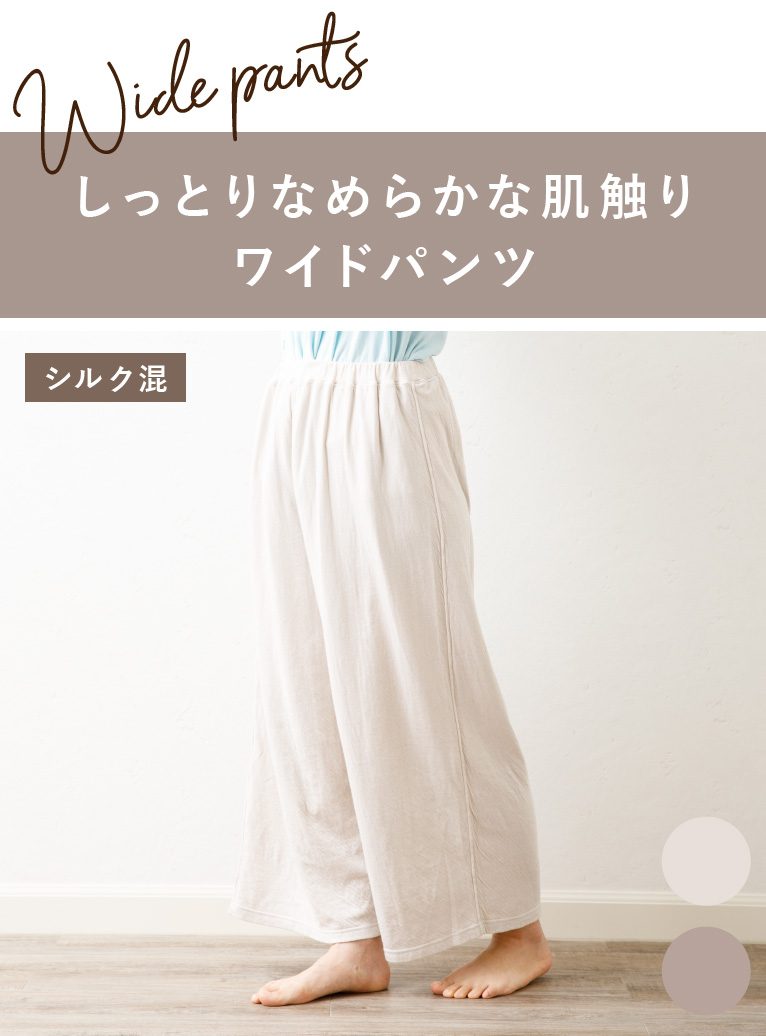 ワイド&気持ち短めな丈感で脚のラインがきれいにみえるシルエット。通気性がよく、軽やかに着ることができます。きれいなドレープ感があり透けないので、冬は下にタイツを重ねればちょっとしたおでかけにも◎ウエストのゴムは幅広のタイプを使用しているのでしめつけず、やさしくフィットします。