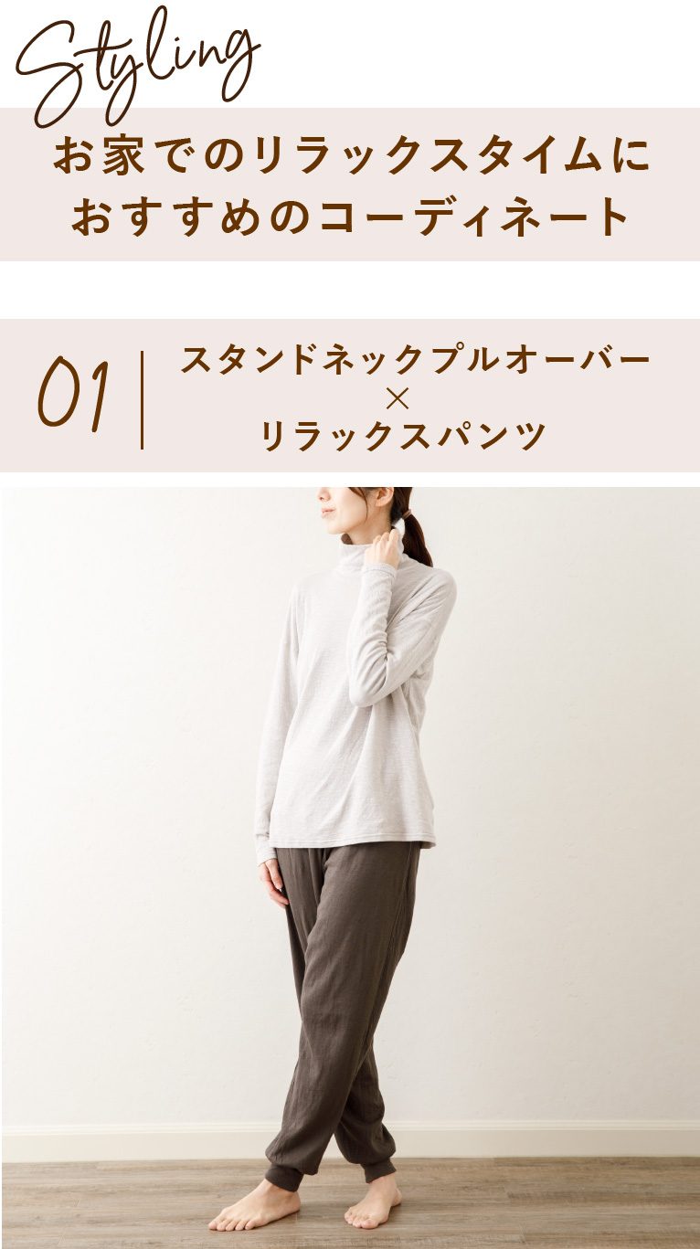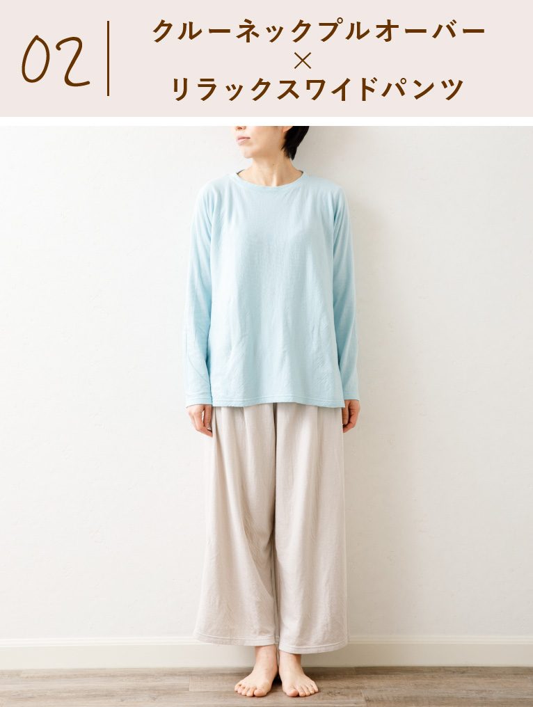 全体的にゆったりとしたラインのコーディネート。首元も開きすぎずしめつけないのが丁度いいトップス。ワイドパンツと合わせるとリラックスタイムに最適のコーディネートが完成。