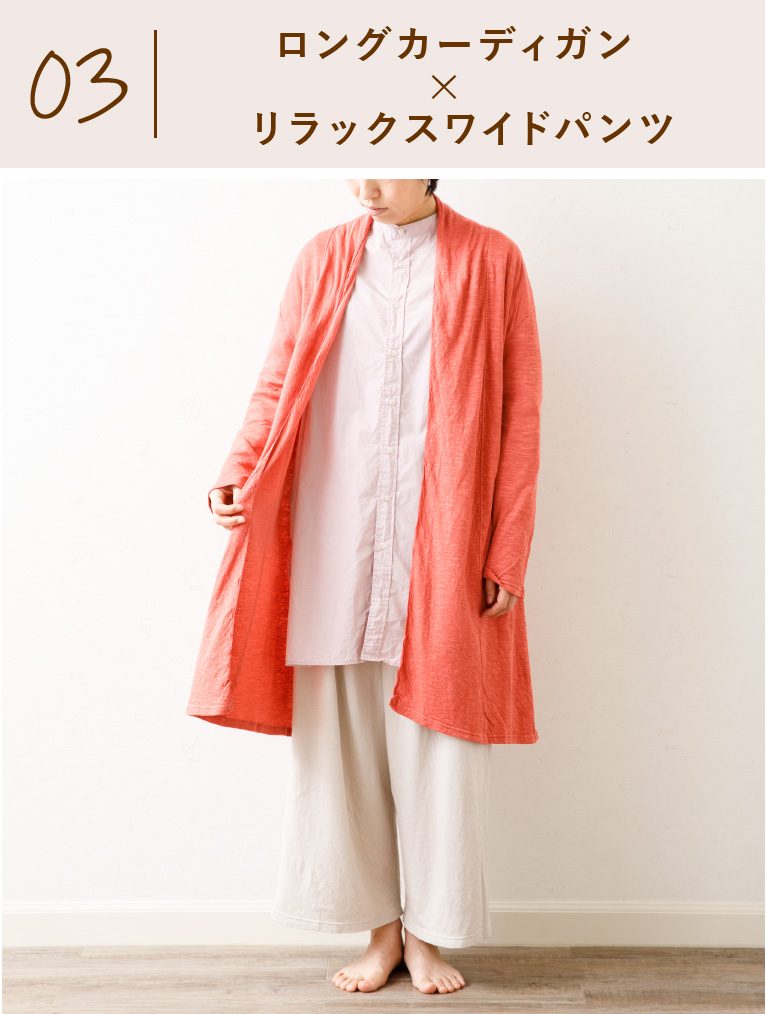 ゆったりとしたカーディガンとワイドパンツの組み合わせ。カーディガンの「茜」の華やかなカラーとパンツの淡いカラーの相性は抜群です。