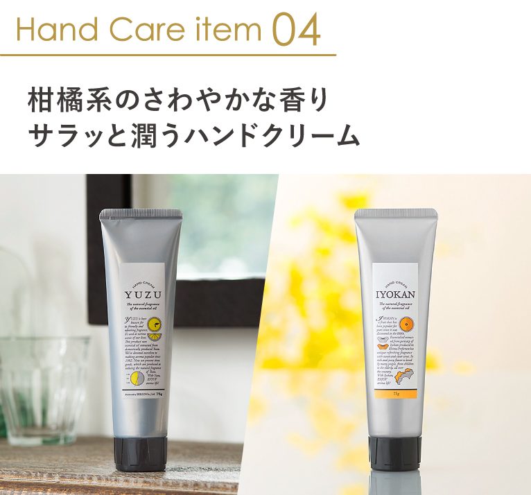 自然の香りが心地良い国産の柑橘類の精油だけで香りづけしたハンドクリーム。高知県産のユズや愛知県・香川県産の伊予柑など産地にこだわり、水蒸気蒸留法で抽出したフレッシュでみずみずしいエッセンシャルオイルを使用。シアバターやオリーブオイル配合でベタつかずしっとりとした使い心地です。