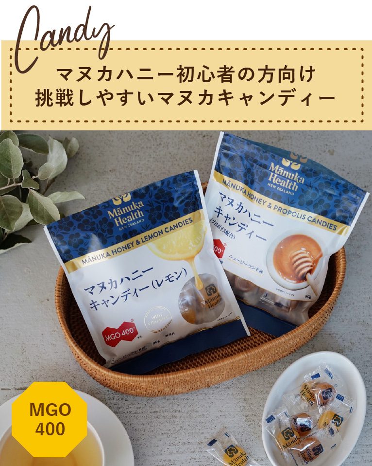 MGO400のマヌカハニー&プロポリスを配合した本格派のマヌカハニーキャンディです。美味しく健康なからだづくりをサポート!レモンフレーバーは清涼感のあるまろやかな味わいが広がります。「マヌカハニーを試してみたいけど、どれを買えば良いか分からない…」というマヌカハニー初心者の方におすすめのアイテムです。