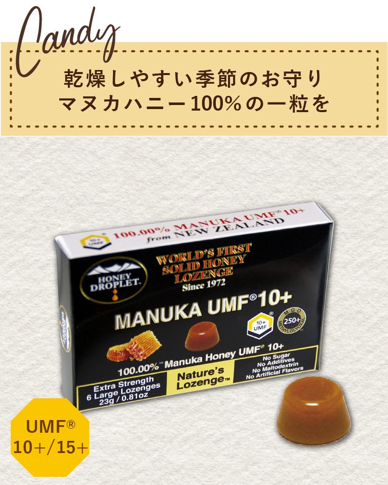 マヌカハニーを一切の添加物を加えることなくギュッと固形化したのど飴。夏でも溶けにくく、常温保存で美味しくお召し上がりいただけます。持ち運びに便利なコンパクトサイズなのもうれしいポイント♪ゆっくりなめて約10分、なめずに口の中に入れておくと約30分、お楽しみいただけます。