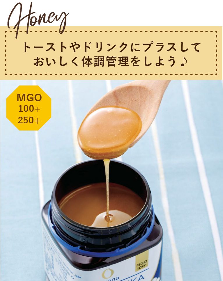 一日一回スプーン一杯をそのままなめるのはもちろん、トーストに塗ったりお好きなお飲み物に混ぜたりしてお召し上がりいただけます。「MGO100+」「MGO250+」の2種類あり、MGOの量でお選びいただけます。
