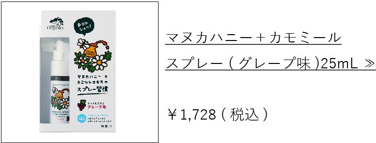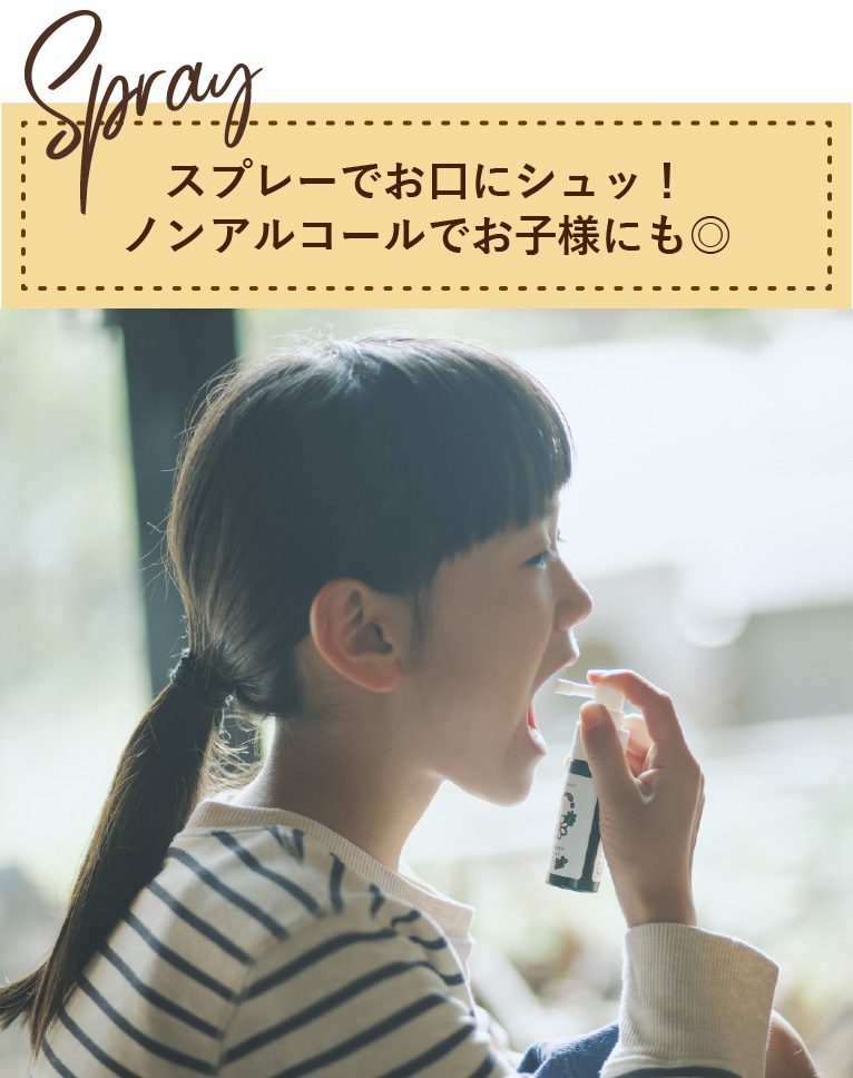 いつでもどこでもシュッとして健やかな毎日をサポートするスプレー。ノンアルコールなので小さなお子様(2歳以上)や妊婦さんにもおすすめ。お子様が美味しく食べられるグレープ味です。