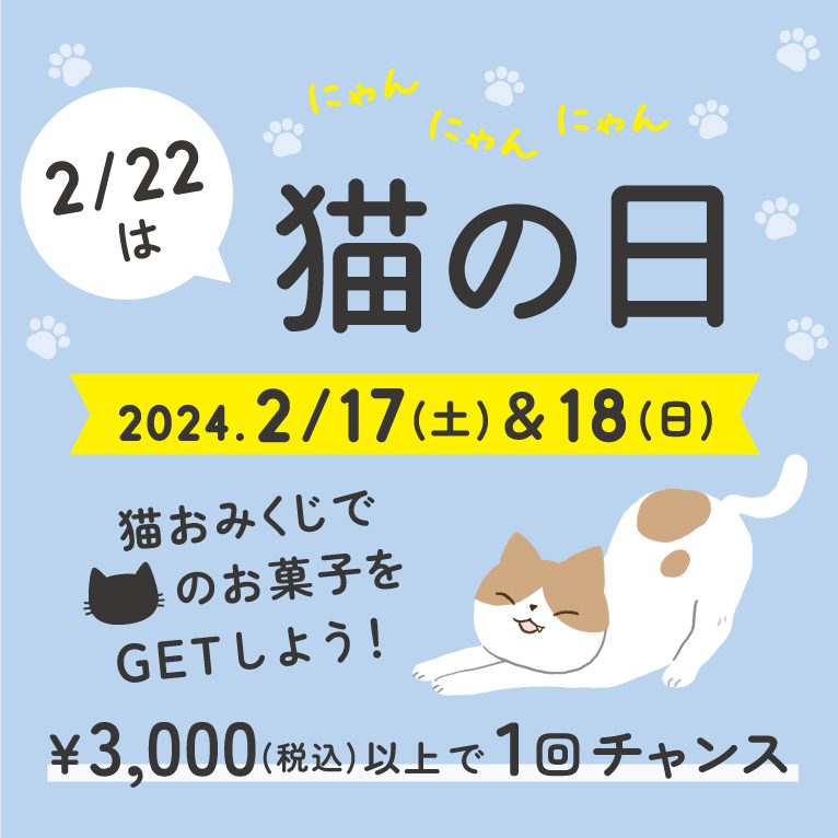 猫の日にちなんで、2月17日(土)・18日(日)は猫おみくじを開催!期間中、税込¥3,000以上のお買い物レシートをご提示で、お一人様1枚につき1回ご参加いただけます。ほっこりメッセージのおみくじと猫のお菓子が当たります♪