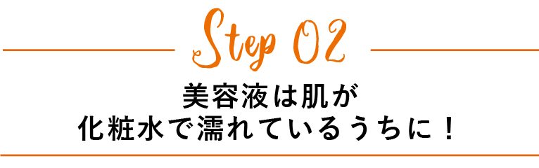 化粧水で肌がうるおい、古い角質のごわつきが軽減されたら肌がまだ化粧水で濡れている間に美容液を使いましょう。化粧水の浸透に続いて、美容液が浸透しやすくなります。