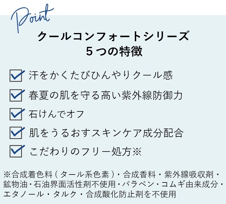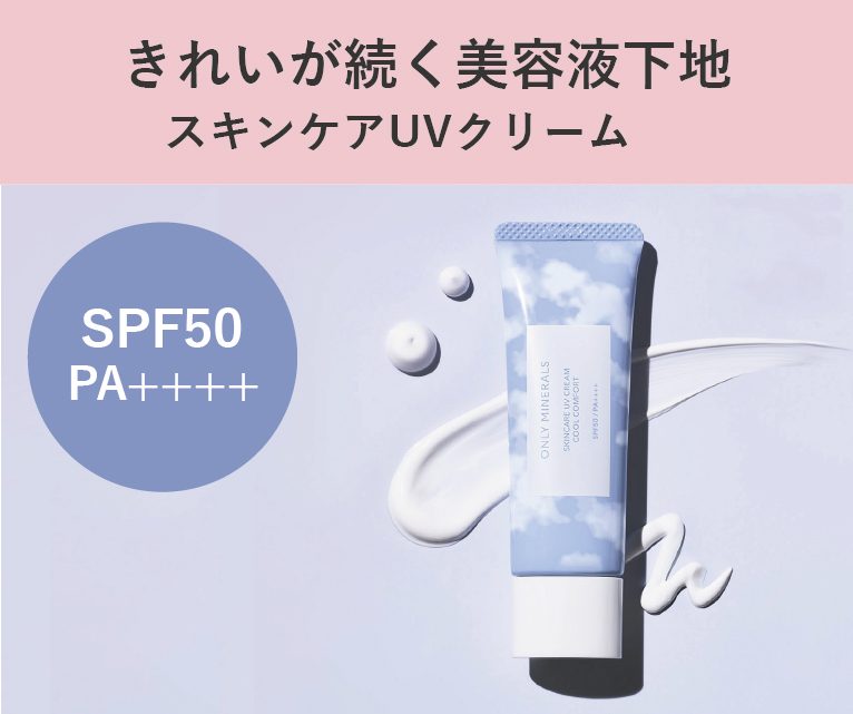 大人気のオンリーミネラルシリーズから、春夏の限定品が今年も登場!肌負担が多くなる季節にうれしい紫外線吸収剤不使用&石けんでオフできるところがお気に入り。肌をうるおすスキンケア成分も高配合。さらに刺激が少なく持続性のある冷感成分のメンソール誘導体配合(※)なので汗をかくたびひんやりしてきもちいいです◎