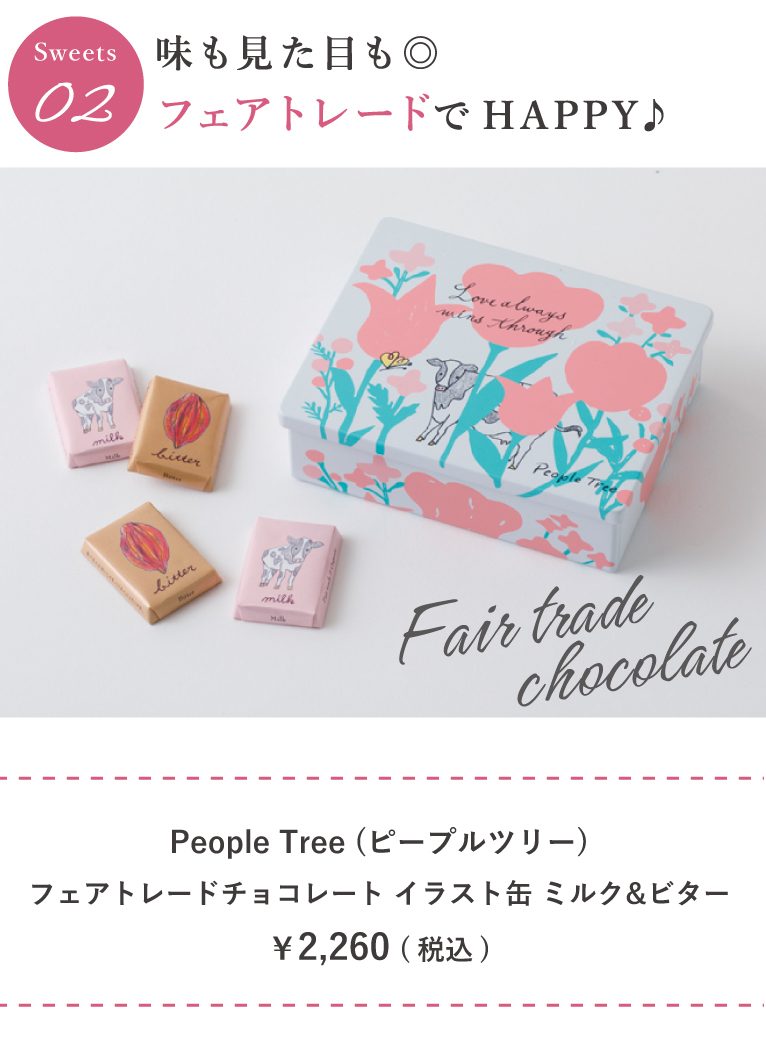 フェアトレード&オーガニックの原材料で作られたチョコレート缶。黒糖を使ったミルクチョコとカカオ分61%のビターチョコが7粒ずつ入っています。ココアバターのまろやかな口あたりが魅力。添加物を使わず伝統の技術で72時間練ってカカオの風味を引き出すなど、材料にも製法にもとことんこだわって作られたチョコレートです。