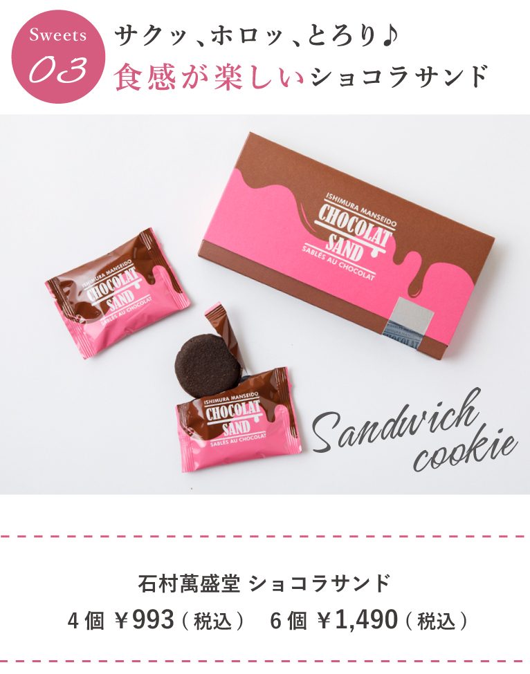 明治時代から続く老舗の製菓会社『石村萬盛堂』のショコラサンド。カカオクッキーでキャラメルとビターチョコレートをサンドしたスイーツです。濃厚な味わいのとろけるキャラメルとチョコレートは甘いもの好きにはたまりません。個包装なので職場の方へのプチギフトにぴったりです。