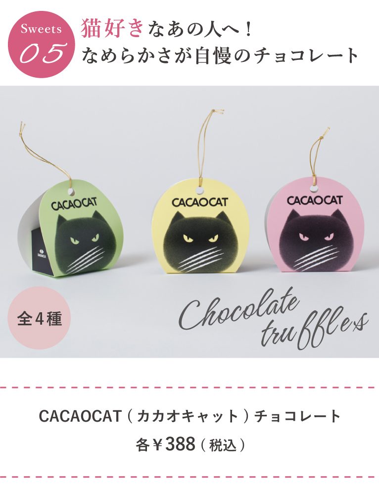 究極のなめらかさと素材にこだわったプレミアムチョコレートブランド『CACAOCAT(カカオキャット)』。マレーシア出身アーティストKamwei Fongさんとのコラボパッケージは猫好きな方に喜ばれること間違いなし!猫の爪あとをイメージしたラインが入ったチョコレートが2個入っています。