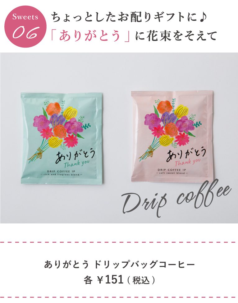 温かみのある花束のイラストと「ありがとう」がプリントされたアミングオリジナルのドリップコーヒー。軽い口あたりとコーヒーらしい深い味わいを楽しめる「グリーン」とコーヒー豆の自然の甘さをいかした「ピンク」があり、贈る方の好みに合わせて選べます。他のアイテムと合わせてメッセージカード代わりにするのも◎