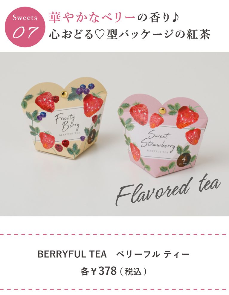 コロンとしたハート型パッケージのフレーバーティー。3つのベリーの香りをMIXした「フルーティベリー」といちごとバニラが香る「スイートストロベリー」。どちらも春にぴったりのフレッシュなフレーバーです。クッキーやスイーツとあわせて紅茶好きな方へのギフトにいかがですか?